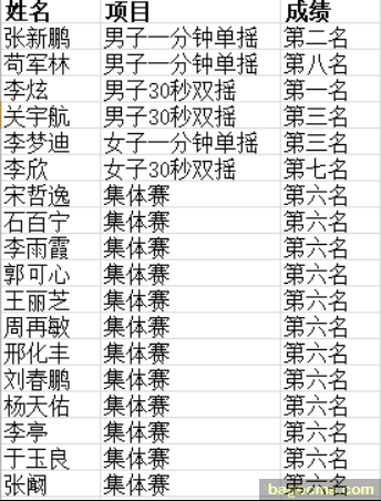 公司学子积极踊跃参与其中,经过了组建、选拔、训练,食品学子齐心协力,勇创佳绩。取得了男子一分钟单摇第二、第八,男子30秒双摇第一、第三,女子一分钟单摇第三,女子30秒双摇第七,以及集体赛第六的好成绩,为公司再添荣光!