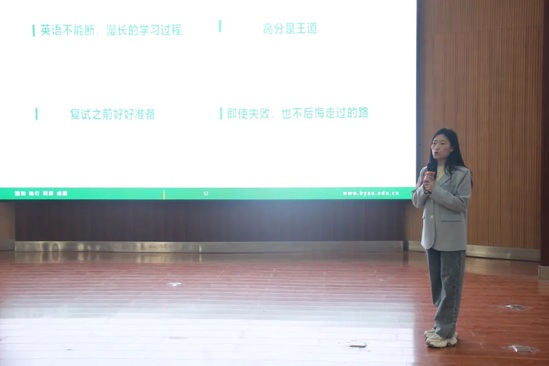 在主讲人分享环节中,陈宇佳同学通过其个人大学四年成长经历、校内外保研条件、保研材料准备及成绩核算方法等内容进行了分享,给同学们提供了学业规划建议、考研学习方法技巧、保研时间点等相关内容,并提出了很多具有针对性的建议。