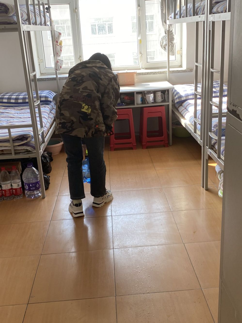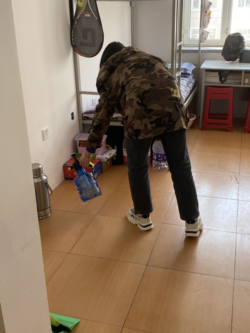 活动当日下午同学们进行了寝室清扫和物品清理,保证地面彻底清洁,无垃圾堆放、无积水;室内窗户擦拭干净、窗框无积尘;桌面、桌内保持干燥、清洁;寝室内各类物品干净、整洁,同时清理寝室内存在的报纸、废旧书籍、废旧塑料制品、废旧衣物等各类易燃物品,清除寝室内的各类违规物品等。由寝室长到所在楼层“志原服务点”领取物资,并在志愿者指导下对寝室环境进行消杀于当日15:00完成全部消杀任务。