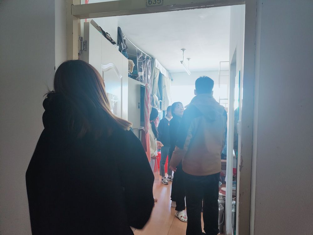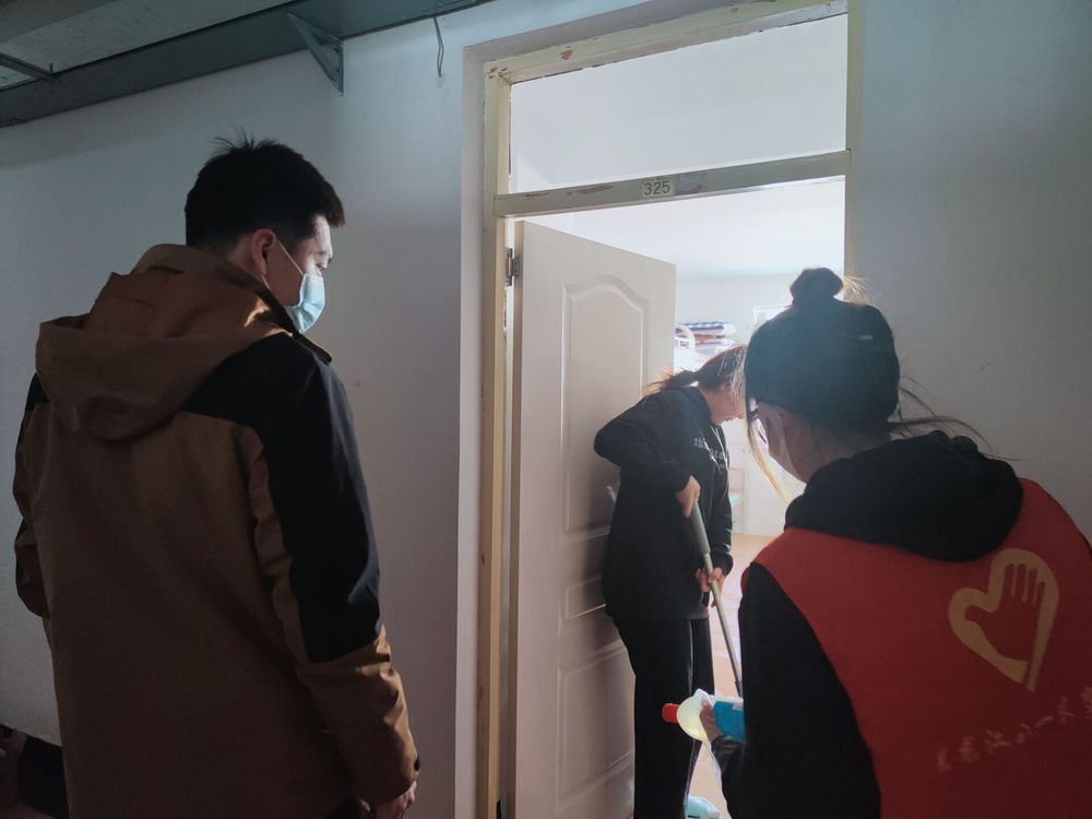 辅导员老师也进入寝室查看打扫过程情况。