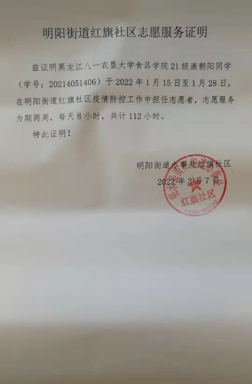 康朝阳同学,在2021年大一的寒假参加了黑龙江省明水县的疫情防控志愿活动,她的主要工作是对社区全员核酸检测做数据统计,同时对社区人员疫苗的接种状况进行统计,她在志愿期间认真负责细心周到,她严格落实疫情防控的每一个措施,虽然很累,但是她没有放弃,她做志愿者,除了是响应U8国际的号召,也想助力家乡防控疫情,给别人带来温暖,她付出了时间和精力,同时她也得到了社会的认可,更收获了别人所没有的人生阅历,成长和进步,她用勇敢传递了正能量,用实际行动展现了当代青年的责任担当。