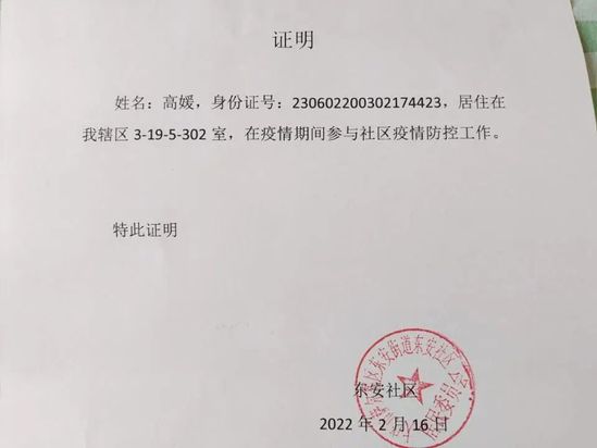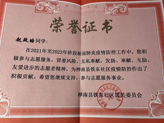 在疫情以来,他志愿服务于桦南县铁东社区,在管理区的疫情防控点打电话进行询问摸排,对出入人员进行测温,秩序维护,对外来人员信息登记,宣传工作,车站点检测外来人员体温,城区路口检测体温,秩序维护,帮助隔离人员清理垃圾为隔离人员贴封条等,并且参与过佳木斯市桦南县全民核酸。