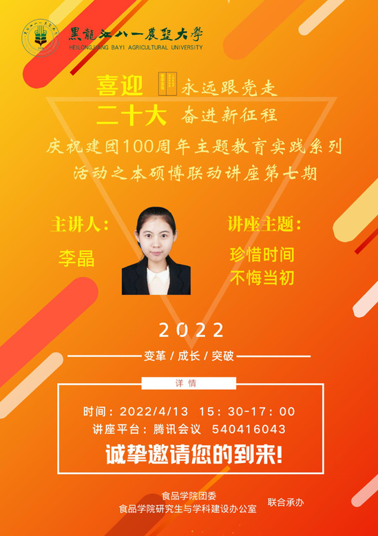 本次讲座由李晶学姐以珍惜时间为主题展开演讲,让同学们更加珍惜时间,珍惜当下。时间是世间所有资源中最宝贵的。正是精确的时间观念,才让生命充满能量。我们正处于青春的大好年华,所以一定要做有意义的事情,不负青春,不负韶华。年华易逝,永久难觅;珍惜时间,创造未来。不要让我们的年华白白逝去,也不要让我们的生活周而复始的轮回,就用最好的行动来纪念我们逝去的年华吧!