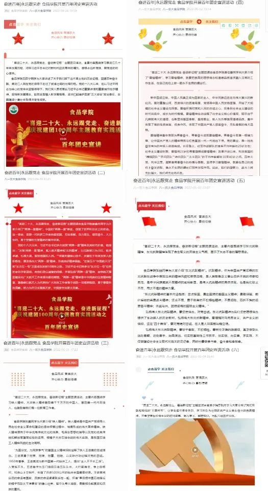 青年引领有效度。组织收看公司“青春心向党、建功新时代”纪念五四运动103周年暨2021年度共青团工作先进集体及个人表彰大会。以员工组织、团支部为单位开展以“喜迎二十大、永远跟党走、奋进新征程”为主题的系列线上团课、“《新时代的中国青年》白皮书”主题宣讲等主题团日活动等。公司团委组织“食代之声”老员工宣讲团,共录制团史宣讲视频6期,他们用亲切轻松的语言、精彩纷呈的故事,深入浅出地解读党的创新理论,讲好团史和催人奋进的青春故事,线上宣讲累计观看人数达6000人,掀起了食品学子学习团史的热潮。