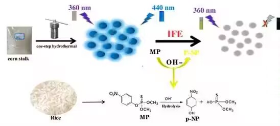 甲基对硫磷因其高效、广谱、可通过接触和摄入途径对昆虫产生毒性等特点,在农业生产中得到了广泛的应用,同时也导致其在土壤、空气、水和作物中残留,残留物多种途径进入生物体内,导致神经系统严重破坏,对健康的造成急性或慢性影响,因此,建立一种快速有效的甲基对硫磷检测方法具有的实际意义。本团队开发了基于玉米秸秆的新型碳量子点纳米荧光探针的高灵敏度荧光传感体系,利用碱性催化水解和内滤效应机制实现对甲基对硫磷检测,评价了方法的线性范围、灵敏度、稳定性和选择性。该研究不仅实现对甲基对硫磷的快速高灵敏检测,还为生物废弃物玉米秸秆的利用开辟新方向。