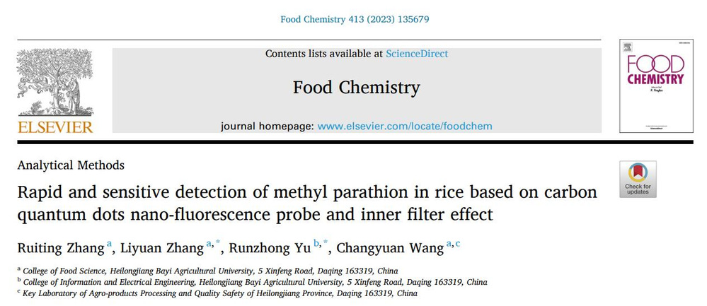 公司U8国际张丽媛教授指导的2020级硕士研究生张瑞婷以第一作者将研究成果以“Rapid and sensitive detection of methyl parathion in rice based on carbon quantum dots nano-fluorescence probe and inner filter effect”为题发表在Top期刊《Food Chemistry》(中科院一区,IF:9.231)(论文连接:https://doi.org/10.1016/j.foodchem.2023.135679)。