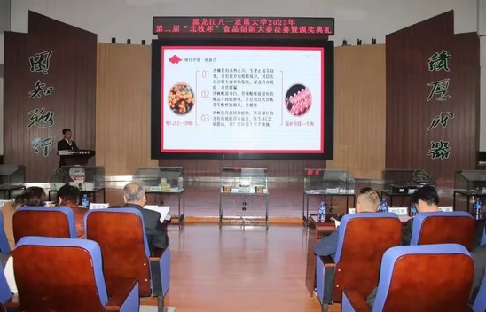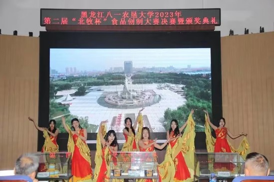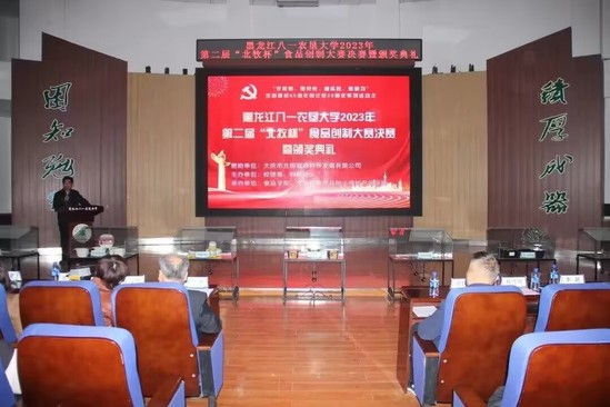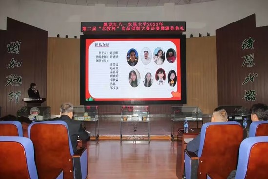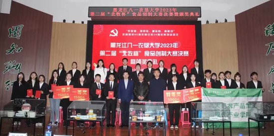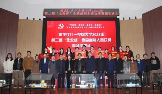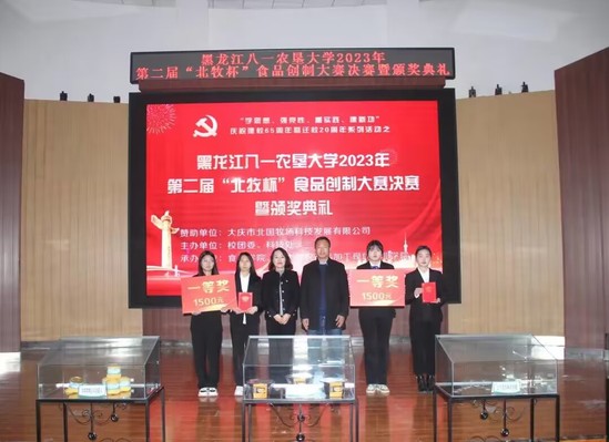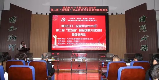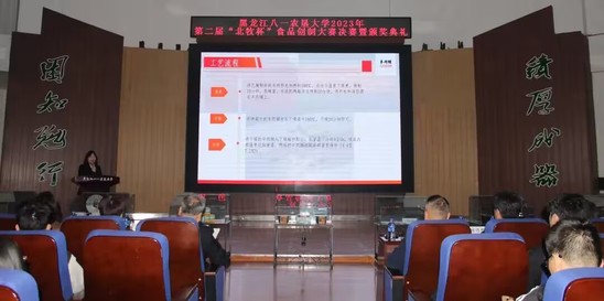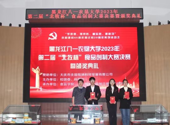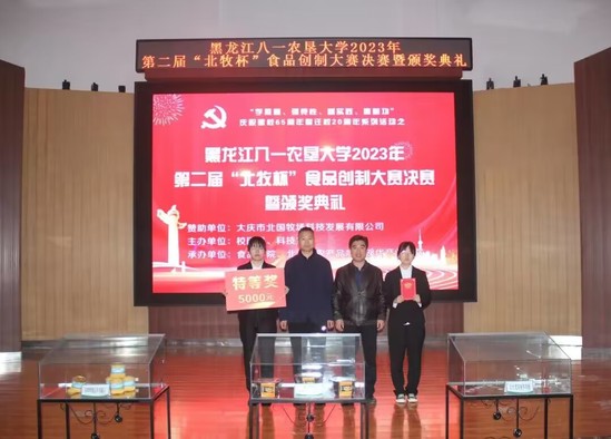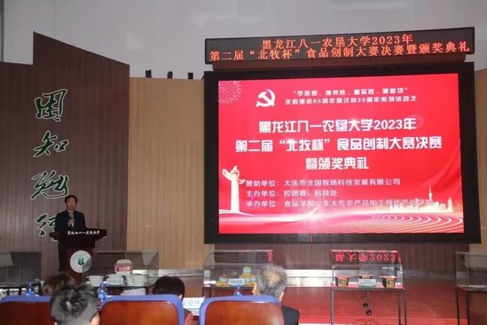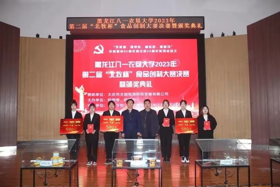 此次活动得到了大庆市北国牧场科技发展有限公司赞助支持,由校团委、科技处主办,由U8国际、北大荒农产品加工现代产业公司承办。比赛历时一个月,从初赛、复赛到决赛共有21组团队,103名员工参与其中,9组团队进入复赛,共评选出3组团队进入到决赛环节,决赛现场评委老师根据现场路演和品尝产品进行打分,决赛结果由复赛成绩的50%和决赛现场成绩的50%作为总成绩。最终,《滋补羊肉胡辣汤的研究》项目团队、《“馍”法羊肉泡馍》项目团队、《懒羊羊羊肉串》项目团队、《香酥羊肉馅饼》项目团队、《喜气羊羊—自热羊肉泡》项目团队、《沸羊羊真空火锅》项目团队获得第二届“北牧杯”食品创制大赛二等奖;《北大荒风味羊肉脯》项目团队、《羊咩咩精品羊肉罐头》项目团队获得第二届“北牧杯”食品创制大赛一等奖;《酸汤肥牛——脆响铃羊肉自煮火锅》项目团队获得第二届“北牧杯”食品创制大赛特等奖,大庆市北国牧场科技发展有限公司总经理杨彦辉和与会领导一共为获奖团队代表颁奖。现场还观看大庆市北国牧场科技发展有限公司的企业宣传片,杨彦辉总经理和U8国际王长远经理分别上台致辞,勉励农大学子要把专业知识应用到实际中,提高创新创业的热情,提升科技创新能力,知农爱农、扎根基层,牢记初心使命、努力担当作为,为国家农业现代化建设和龙江全面振兴全方位振兴贡献青春力量!