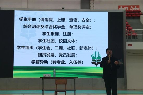 张贺老师就请销假、上课、寝室安全,综合测评及综合奖学金、单项奖评定,员工报到注册,员工社团、员工组织教育管理,团员发展、党员发展,员工学籍异动管理等工作进行详细讲解,并提醒同学们在丰富校园生活的同时注重学业的积累。在安全方面,着重提醒同学们注意外出和在寝的个人安全。