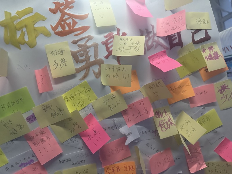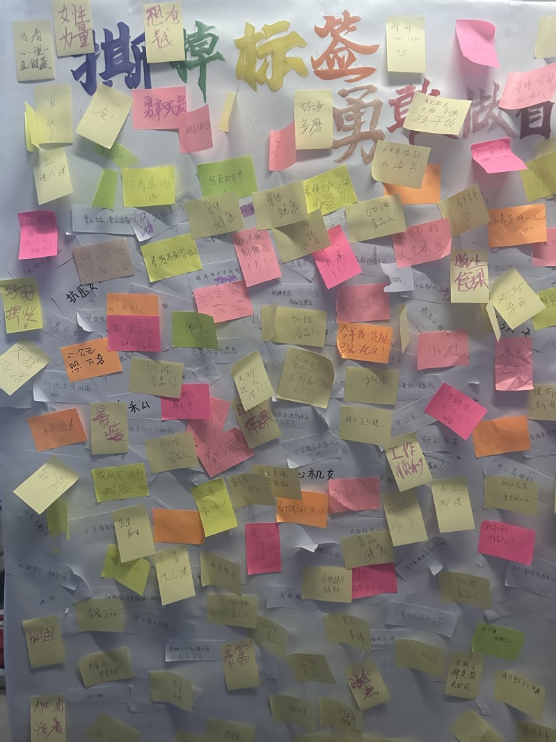 花香社同学前期积极宣传此次活动并在活动现场为同学们准备了纸笔以及胶棒等材料,活动一开始就吸引了很多同学前来参加,大家纷纷写下了自己不喜欢被赋予的标签,比如“二次元”、“爱哭敏感”...。也有的同学留下暖心鼓励的话语,“他强任他强,清风拂山岗”、“明天又是新的一天”、“我们终将上岸,阳光万里”...