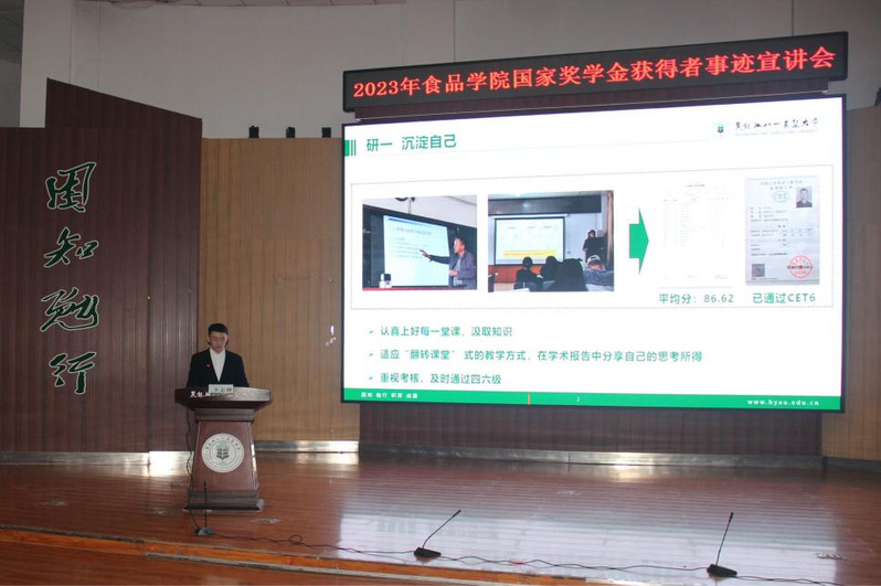U8国际食品科学与工程专业2021级硕士研究生李志明把全部心思放到了学习上,利用各类学习资源,提升科研写作能力,他获得两项省级竞赛三等奖、发明专利进入实审、主持一项研创项目、参加国际研讨会并做汇报,在宣讲的结尾,他鼓励同学们珍惜研究生时光,不负韶华,方得始终。