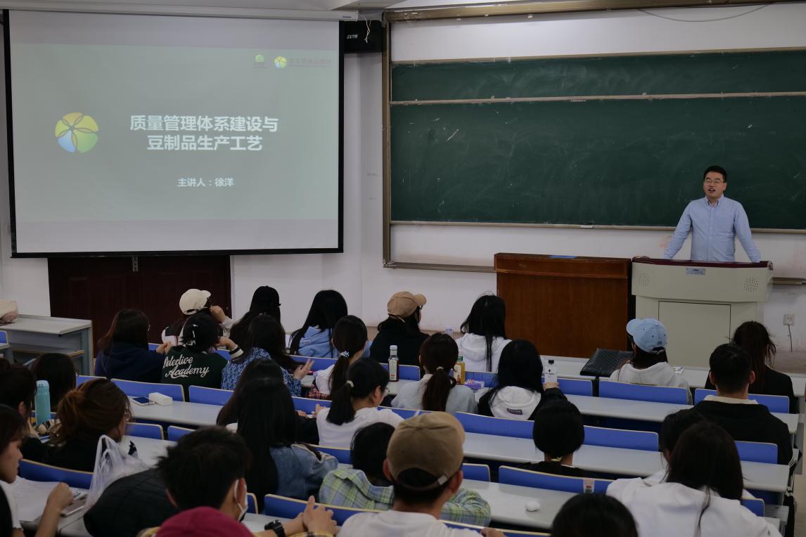 王雪东和徐洋分别进行了题为《迈出校园职业规划第一步,你准备好了吗?》和《质量管理体系建设与豆制品生产工艺》的教学讲座,两位企业教师从介绍北大荒食品集团企业文化和战略布局到如何从员工转变为“社会人”所需具备的基本能力要求和HR招聘背后的故事,从企业如何建立质量管理体系、审核员的作用到豆制品生产工艺流程图、各工段设备及关键控制点、质检员的工作职责等一系列生动又专业的内容,通过视频传导、案例剖析、互动交流等多种形式,详细讲解了高校员工步入社会工作应具备的基本能力和专业素养。