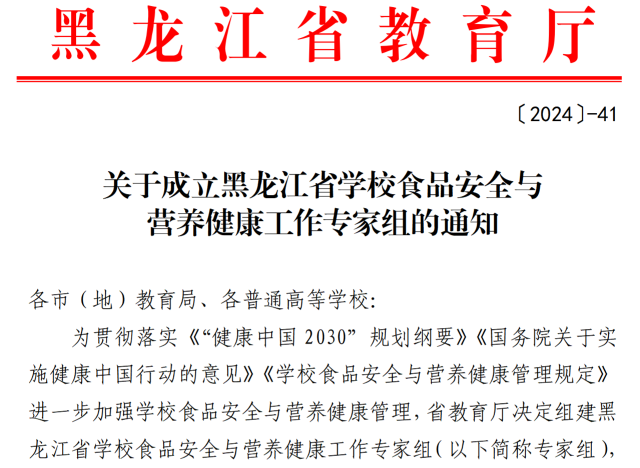 为贯彻落实《“健康中国2030”规划纲要》《国务院关于实施健康中国行动的意见》《公司食品安全与营养健康管理规定》,进一步加强公司食品安全与营养健康管理,黑龙江省教育厅下发了《关于成立黑龙江省公司食品安全与营养健康工作专家组的通知》[(2024)-41],组建黑龙江省公司食品安全与营养健康工作专家组,成员来自省内高校、事业单位共34人。公司张丽媛经理被遴选为宣教组专家副组长,唐彦君老师被遴选为宣教组专家,王颖老师被遴选为指导组专家。在未来四年里,公司将为全省公司员工的食品安全与营养健康贡献才智与力量。