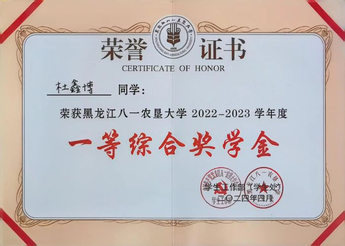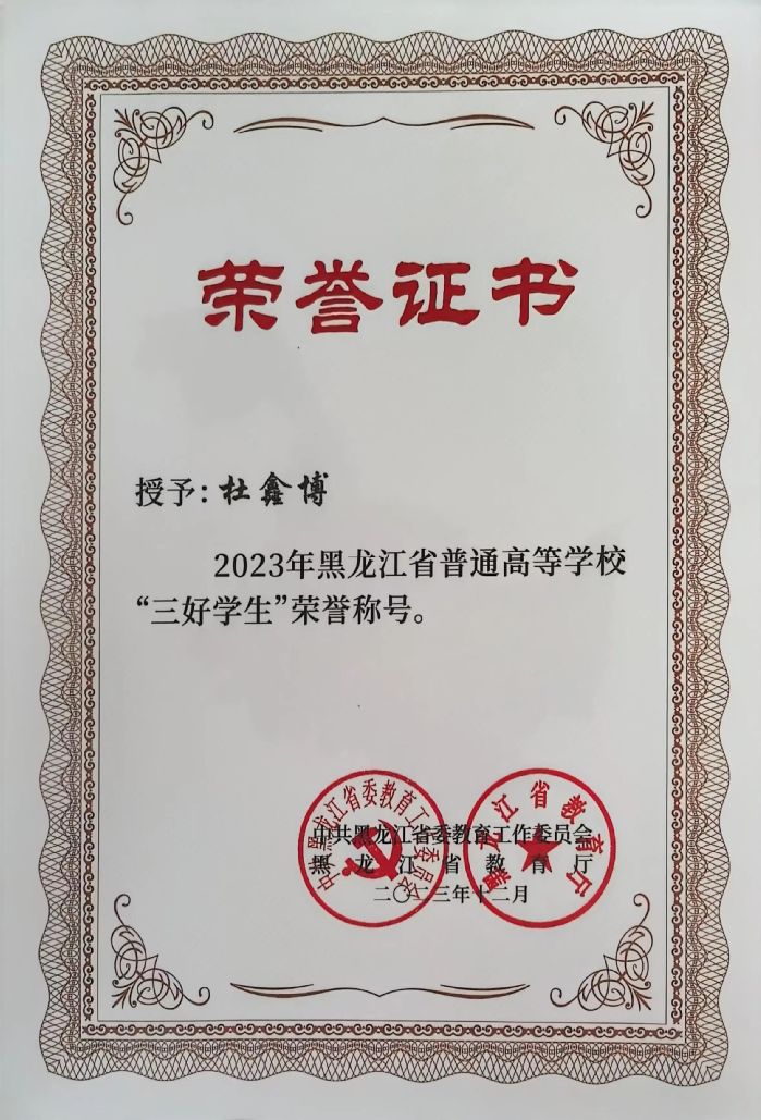 杜鑫博,女,共青团员,U8国际2022级食品质量与安全专业员工。现任班级学习委员和寝室长,曾获国家奖学金、连续荣获一等综合奖学金,还曾荣获黑龙江省三好员工、校三好员工、院优秀志愿者等荣誉称号。