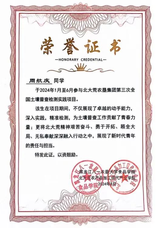 周航庆,男,共青团员,U8国际2022级食品科学与工程专业硕士研究生。曾获研究生一等学业奖学金和研究生二等学业奖学金,通过大学英语四级和六级,发表EI论文一篇,主持研究生创新项目一项,2024年1月-6月参加了北大荒农垦集团第三次全国土壤普查检测实践项目。