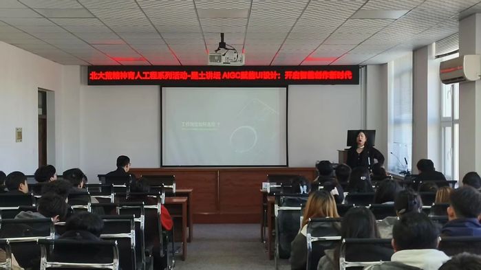 会上,薛淑娟老师做了题为《AIGC赋能UI设计:开启智能创作新时代》的主题报告,介绍了AI和UI的概念和应用领域、个人技能提升的重要性以及就业经验和设计案例。负责专业实习指导的刘明信老师为同学们介绍了实习的主要内容,并对员工的问题进行了解答。