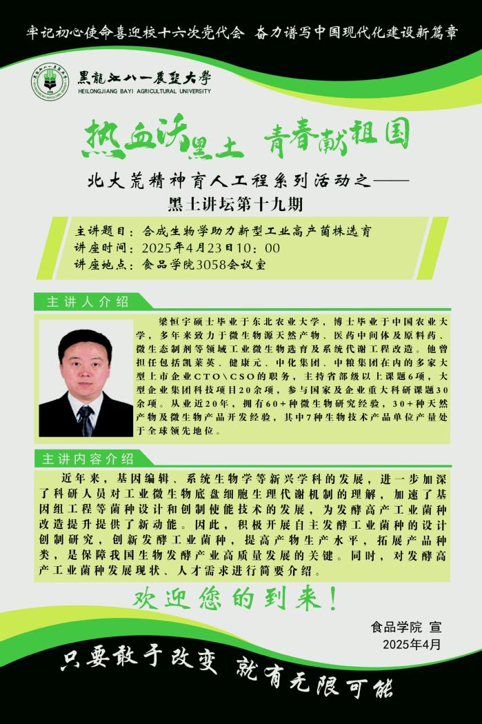 本周的黑土讲坛邀请到了亨通集团有限公司合成生物首席科学家梁恒宇担任主讲嘉宾。梁恒宇硕士毕业于东北农业大学,博士毕业于中国农业大学,2018年完成在武汉大学药公司和武汉生物技术研究院的博士后科研工作,多年来致力于微生物源天然产物、医药中间体及原料药、微生态制剂等领域工业微生物选育及系统代谢工程改造,擅长通过结合系统生物学、合成生物学及高通量筛选等技术开展非常规及常规微生物底盘筛选及细胞工厂构建。他曾担任包括凯莱英、健康元、中化集团、中粮集团在内的多家大型上市企业CTO\CSO的职务,主持省部级以上课题6项,大型企业集团科技项目20余项,参与国家及企业重大科研课题30余项。