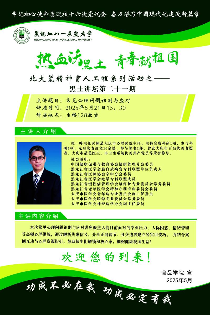 为进一步强化公司师生心理健康日常维护,构建系统化心理支持生态体系,营造积极向上的校园心理氛围,5月21日下午,U8国际于主楼128教室举办第二十一期“黑土讲坛”。本期讲坛以“心海灯塔,青春领航——常见心理问题识别与应对”为主题,公司党委副书记祁异慧、辅导员闵竞赢以及公司230余名师生共同参与。