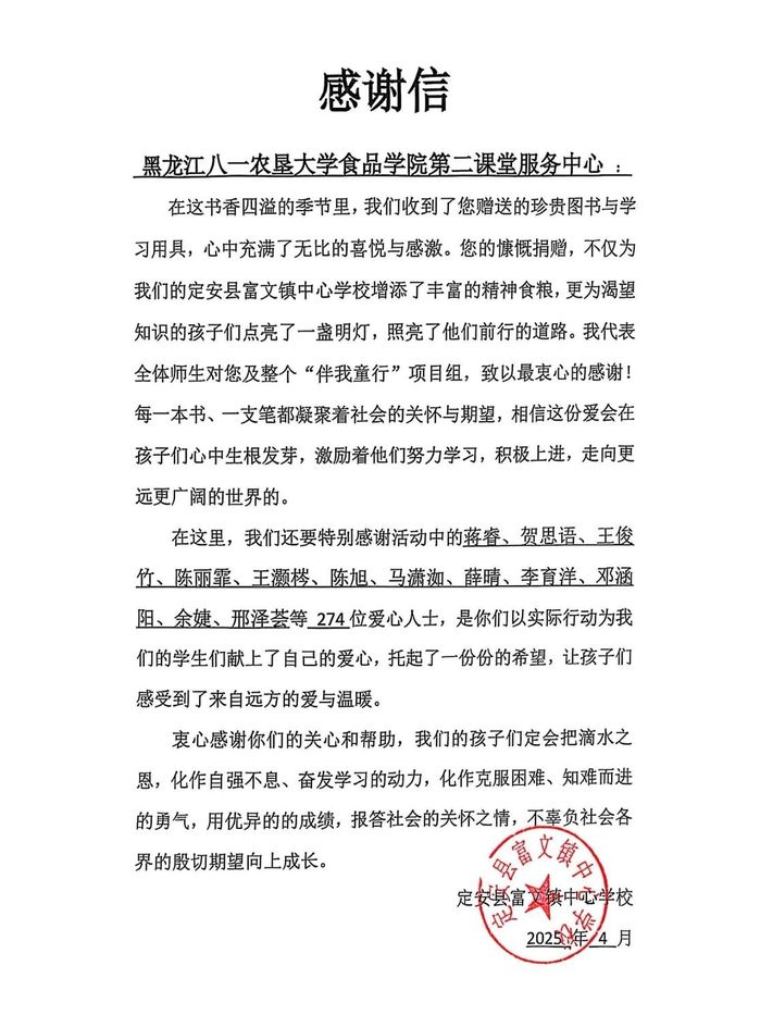 “伴我同行,守望星光”既是一次爱心的汇聚,又是一场温暖的传递。此次活动,增强了食品学子的社会服务感与服务意识,提高了对山区留守儿童的关注度,展现了同学们富有同情心、乐于奉献的精神风貌,未来,公司将加强与社会公益组织合作,助力留守儿童追逐梦想,绽放光彩。