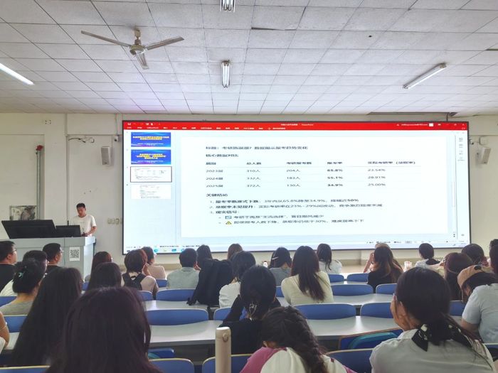会议第三项,U8国际辅导员杨晨老师通过公司近三年的考研、考公趋势以及上岸率等权威数据,并提醒同学们要“两手抓”,在认真备考的同时不要错过各大招聘会。