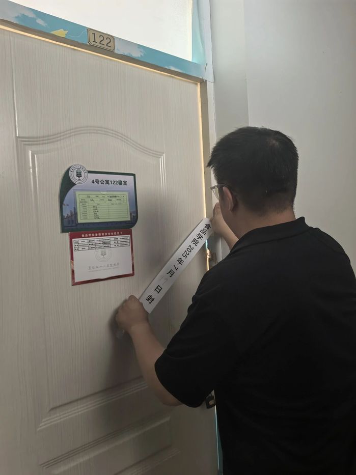 离校同学寝室安全复查行动中,三位老师秉持高度负责的态度,认真检查了寝室的水电设施,对寝室是否断电、门窗是否关闭进行了仔细查验并贴好封条。