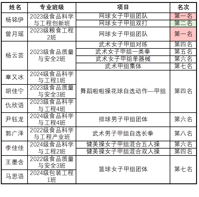 运动健儿们用多份佳绩展现了食品学子的拼搏与风采,他们的赛场故事更诠释了坚持与协作的珍贵。希望全体同学能以他们为典范,在人生的征程中勇往直前,创造属于自己的辉煌成就!