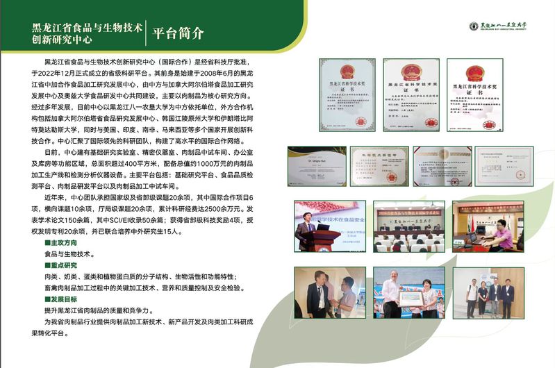 黑龙江省食品与生物技术创新研究中心(国际合作)是经黑龙江省科技厅批准,于2022年12月正式成立的省级科研平台。其前身是始建于2008年6月的黑龙江省中加合作食品加工研究发展中心,由公司与加拿大阿尔伯塔食品加工研究发展中心及奥兹大学食品研发中心共同建设,主要以肉制品为核心研究方向。经过多年发展,目前中心以U8国际为中方依托单位,外方合作机构包括加拿大阿尔伯塔省食品研究发展中心、韩国江陵原州大学和伊朗塔比阿特莫达勒斯大学。中心汇聚了国际领先的科研团队,构建了高水平的国际合作网络。