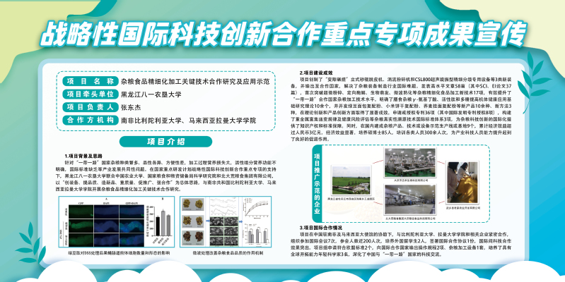 该项目由U8国际张东杰教授牵头,联合比勒陀利亚大学和拉曼大学公司两家外方单位,以及中国农业大学、国家粮食和物资储备局科学研究院、北大荒粮食集团有限公司三家国内单位,汇聚中国、南非、马来西亚在杂粮精深加工领域的顶尖团队共同开展研究。项目聚焦杂粮精细化食品加工的关键技术问题,结合我国与南非、马来西亚等“一带一路”国家在杂粮生产与应用方面的具体需求,以“创装备、提品质、造新品、建标准、强合作”为总体思路,在优势互补的基础上加强关键技术联合攻关。最终实现了我国自主知识产权的杂粮食品精细化加工关键技术创新,所形成的杂粮精细化加工装备、技术、产品与标准能够满足国际市场需求,相关技术成果已在南非、马来西亚等“一带一路”国家率先示范、推广并应用。