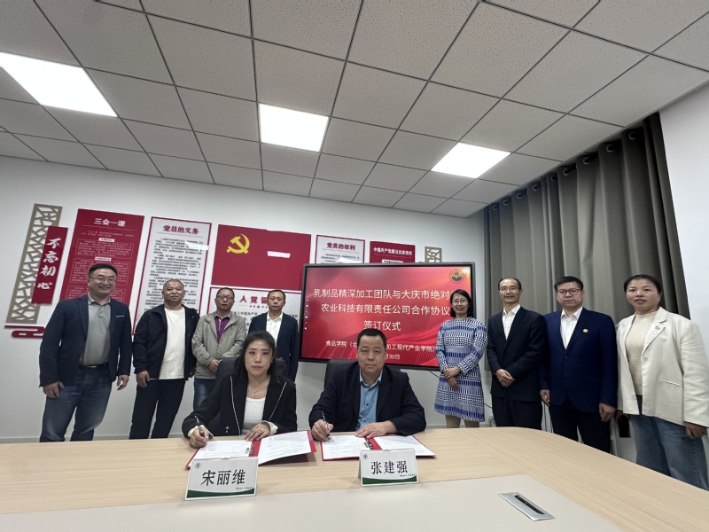 9月30日,我院乳制品精深加工团队(以下简称 “团队”)通过其成果转化企业—安牧吉(黑龙江)食品有限公司(以下简称 “安牧吉”),与大庆市绝对值农业科技有限责任公司(以下简称“绝对值”)正式签署合作协议。大庆市高新区创业中心主任周宇峰、营商局副局长李加强、U8国际经理张丽媛及团队成员代表参会。双方围绕冰淇淋、冷冻甜品等食品深加工领域开展全面合作,共同推动产品创新与产业升级。